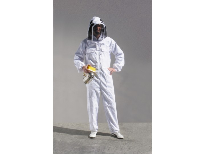Tuta intera professionale, in tela di cotone bianco, molto aerata e adatta ad un lavoro continuativo in apiario. Dotata di ampie tasche ed elastici ai polsi e alle caviglie. La parte superiore è collegata alla tuta tramite una cerniera ed è completamente asportabile.
